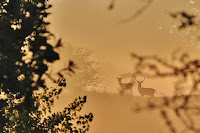 als Joop ..Herman en ik vroeg in de morgen richting Oosterkanaal lopen. Mist is natuurlijk sowieso een mooi fenomeen en ongelooflijk magisch. En vooral nu we het burlen van de herten horen ..Het geluid komt uit het gebied "Schrama" net over het Oosterkanaal.